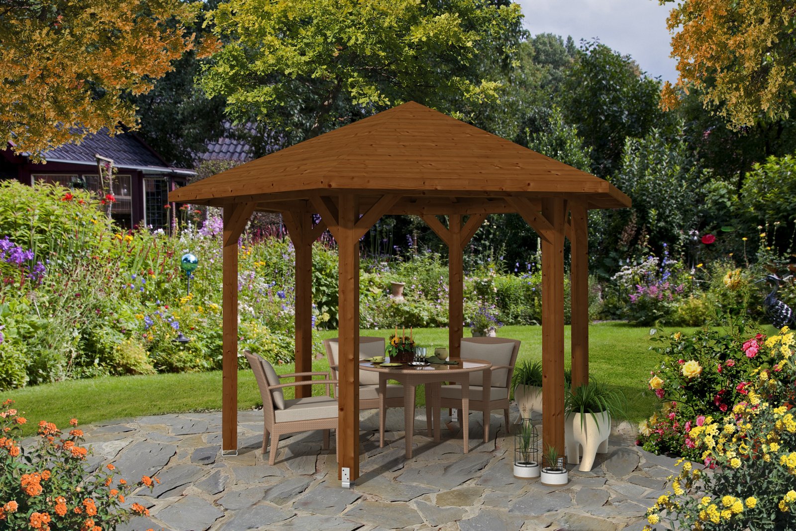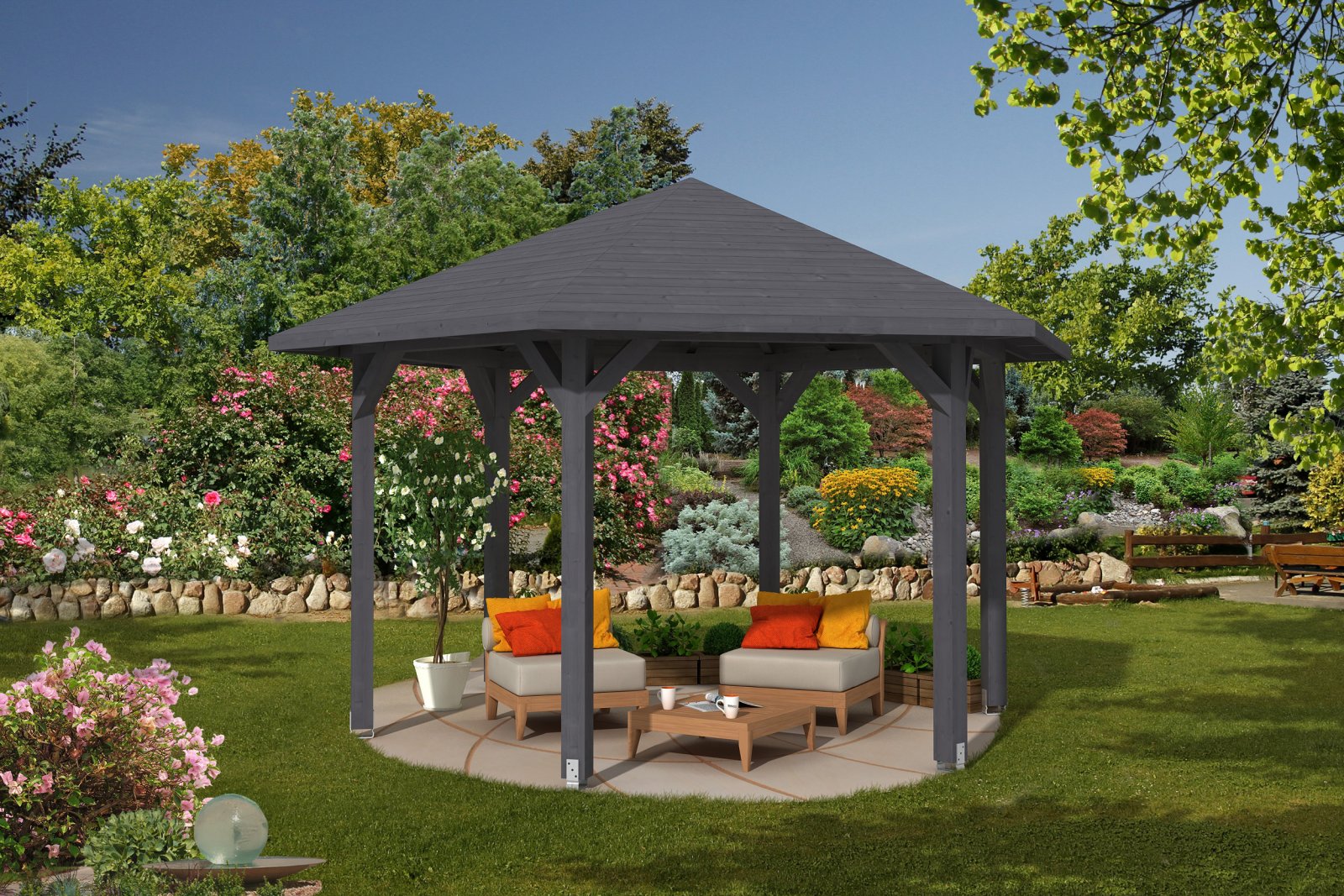 - Sechseckiger Pavillon mit Gesamtdachdurchmesser einschließlich Dachüberstand: 360cm oder 420cm oder 480 cm