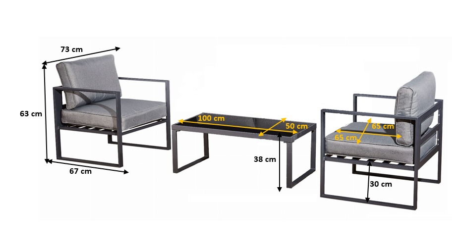 • 3-teilige Terrassenmöbel aus Metall mit Aluminiumrahmen: 2 Stück Mostrare Sessel mit 10 cm dicken Kissen + 1 Stück 100×50 cm Aluminiumtisch. Die hellgrauen Kissen sind im Preis des Sets inbegriffen. Sie sind aus wasserfestem Material (100% Polyester) und können bei niedriger Temperatur gewaschen werden.