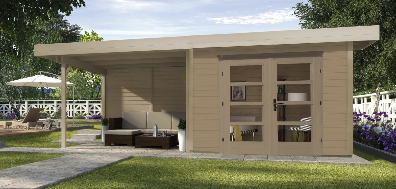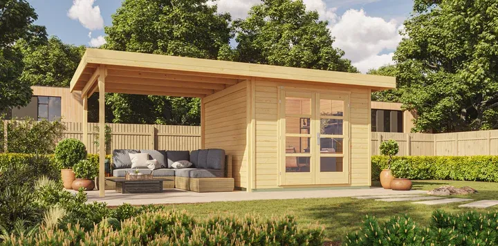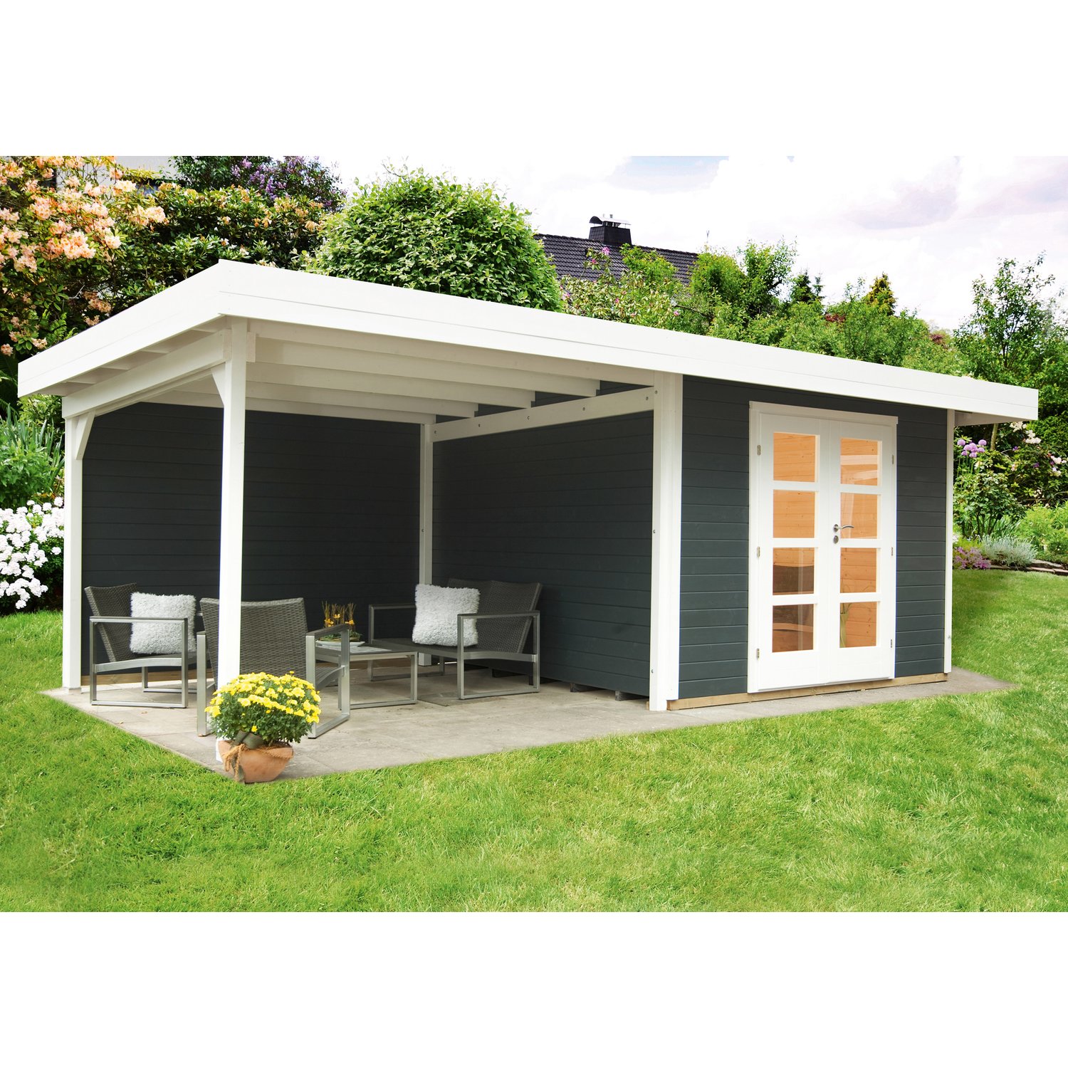 Weka Chillout-Gartenhaus mit einem modernen, minimalistischen Flachdach-Holzhausdesign. Das Dach ist natürlich nach hinten geneigt, aber die Giebelenden lassen die Dachkonstruktion optisch horizontal erscheinen.