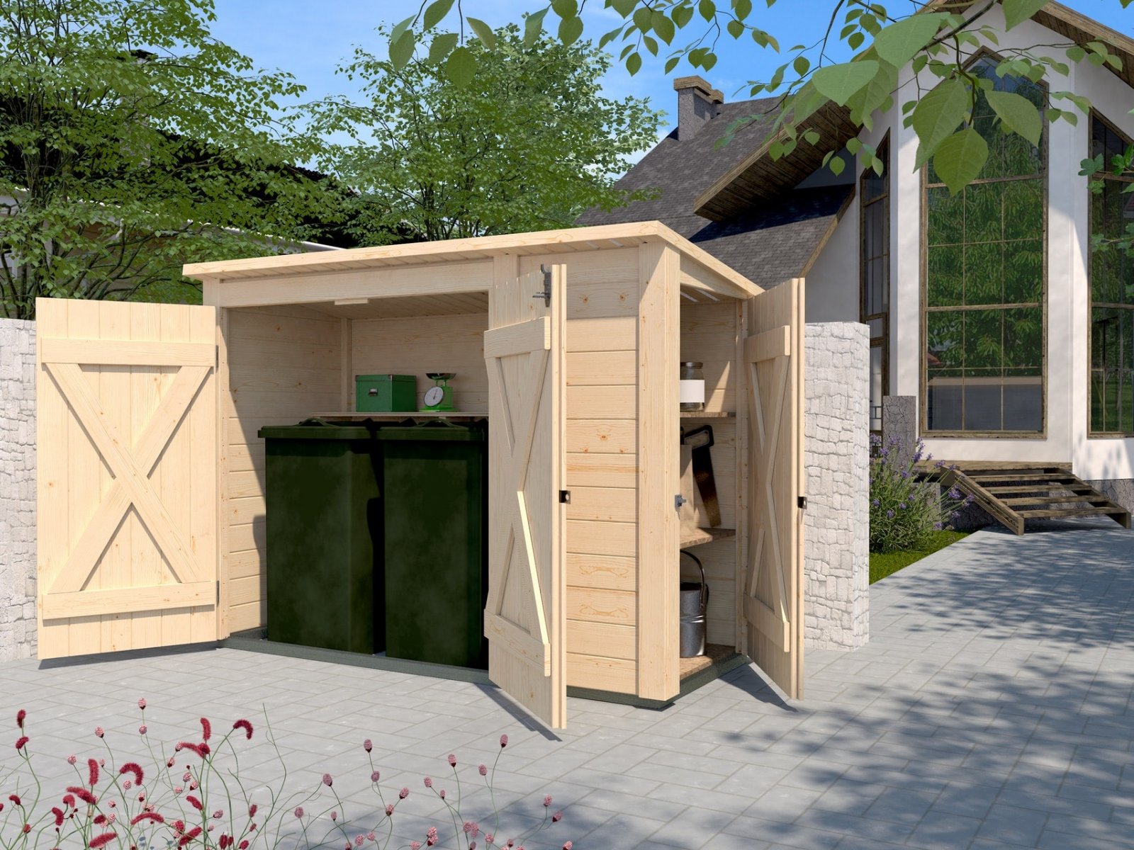 - 2 120-Liter-Behälter + praktischer seitlicher Gerätehaus-Schrank mit 3 OSB-Fachböden 50 x 80 cm werden zusammen mit dem Lager geliefert