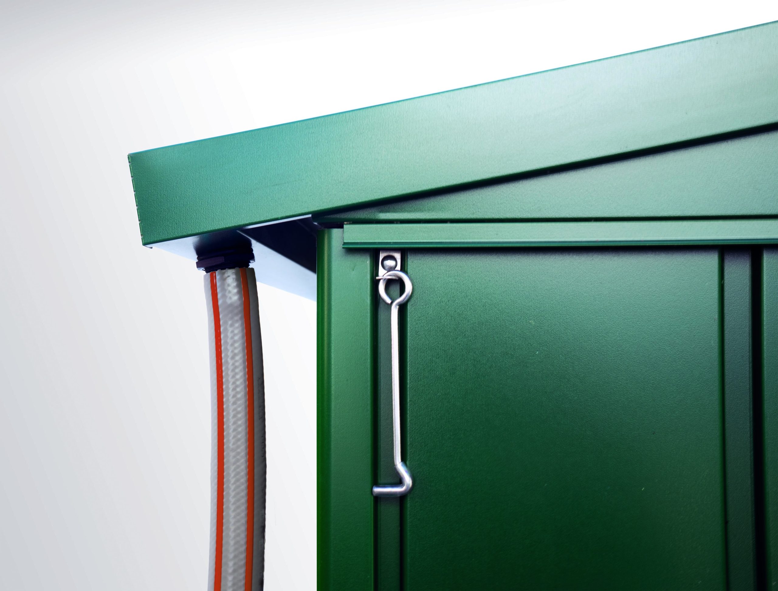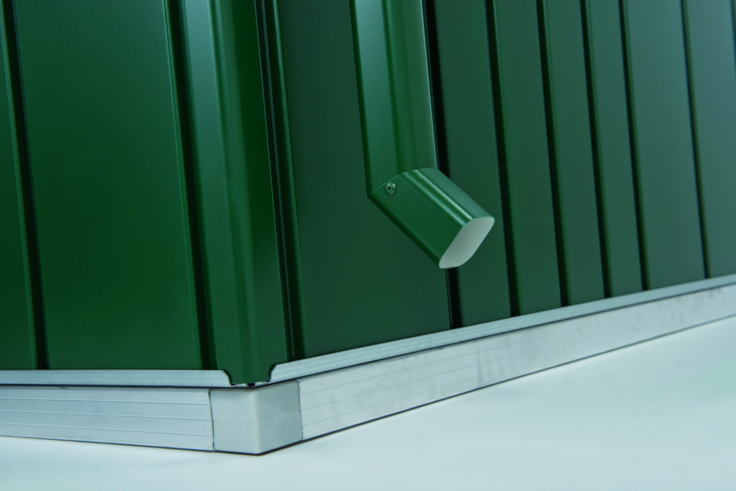 - Vertikales Regenwasserrinnenset (zwei Rinnen in der Farbe des Gehäuses mit Auslauf und Befestigungsmaterial) optional in der Farbe des Metallwerkzeuggehäuses erhältlich