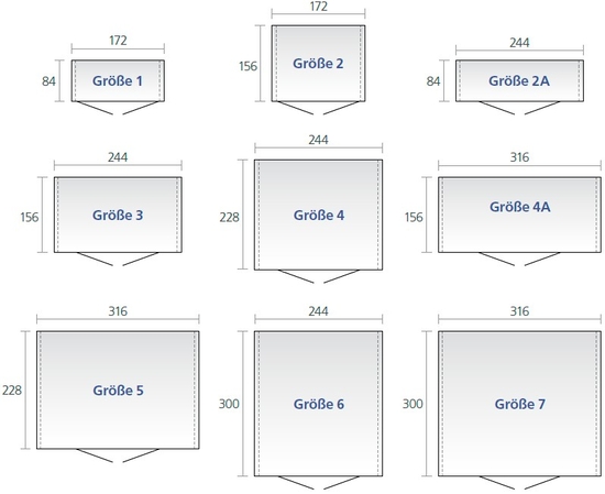 | Méret | 1 (172 x 84 cm), 2 (172 x 156 cm), 2A (244 x 84 cm), 3 (244 x 156 cm), 4 (244 x 228 cm), 4A (316 x 156 cm), 5 (316 x 228 cm), 6 (244 x 300 cm), 7 (316 x 300 cm) |